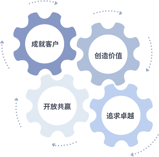 成就客户是一切决策的出发点,,,创造价值是衡量所有工作的标准,,,,追求卓越是我们做事做人的态度,,,,开放共赢是我们的格局也是最终的结果。。。。价值观的齿轮环环相扣,,,推动着组织里的每个人不断向前。。。