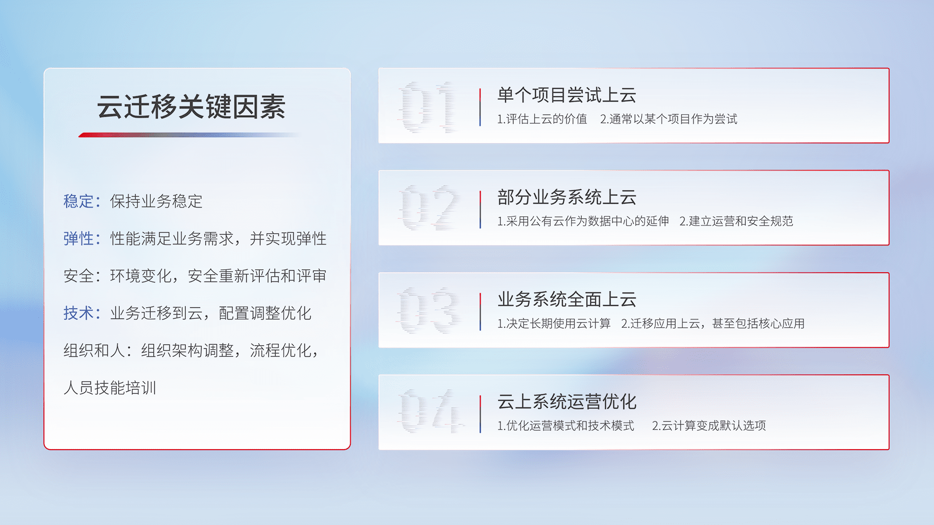 结合实际业务,,从规划设计、、云平台选型、、、、云原生改造、、、、数据迁移、、、集成交付,,,,迁移全过程为客户识别最佳上云路径,,,做好风险识别管理,,设计网络架构、、、、身份权限、、、安全审计合规、、、操作审计、、、日志审计、、监控告警策略、、、多站点容灾设计等,,,,对云上基础设施进行整体规划,,提升IT治理水平,,以满足弹性、、、、高可用、、、高性能的需求。。