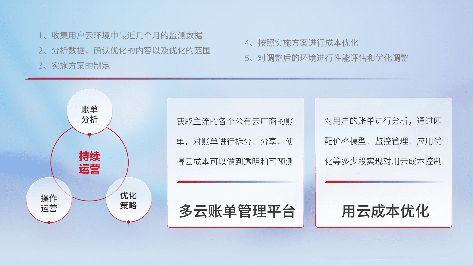 通过多云纳管,,,以统一的资源数据模型把客户的云资源进行抽象和封装,,进而实现对多云资源的统一操作,,保障云资源管理的可靠性、、、、稳定性与可用性。。。量身定制化运维内容,,,配置、、、、开发运维、、、补丁管理、、、备份、、、监控、、、认证和访问管理、、、、审计和日常巡检等,,,,保障在用云过程中的可靠度,,,,稳定度以及高可用率。。。。