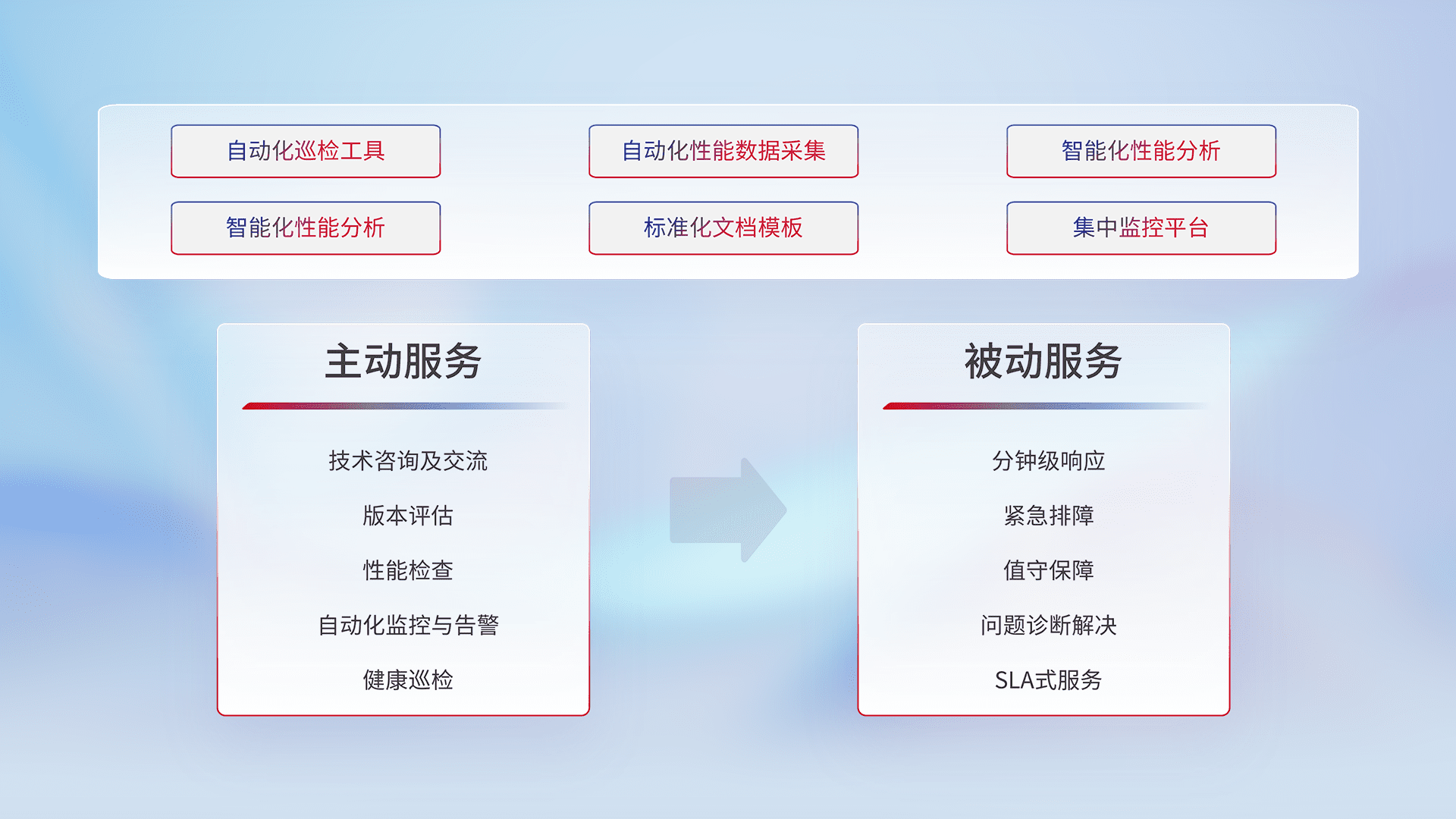 智能化工具和标准化文档,,,保障服务质量,,提供主动服务(包含技术咨询、、版本评估、、、、性能检查、、、、自动化监控与告警、、健康巡检)和被动服务包含(分钟级响应、、、、紧急排障、、值守保障、、、、问题诊断解决、、、、SLA服务)。。